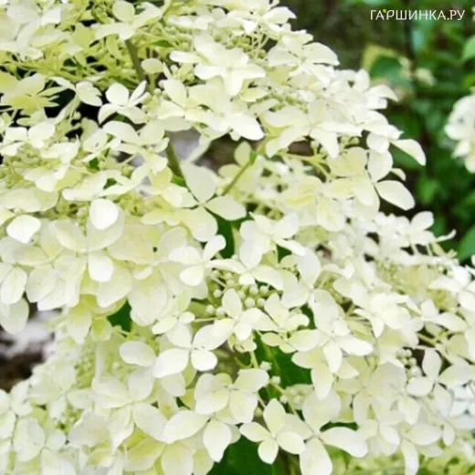 Гортензия Дентель де Горрон метельчатая - кустарник высотой и шириной до 2 м. Крона компактная, шарообразной формы, состоит из крепких прямых стеблей тёмно-бордового цвета, которые не склоняются под тяжестью массивных цветочных метёлок. Обилие белых цветов воздушной формы придаёт кусту сходство с облаком. Листья крупные — 12-15 см в длину, эллипсовидной формы с заострённым кончиком, мелко зазубренные по краю, ярко-зелёного оттенка.