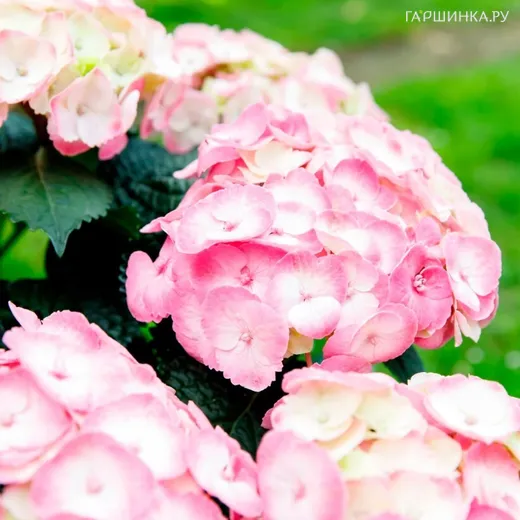 Гортензия Дольче Чик крупнолистная (серия Рембрандт) - куст высотой 30-40см, отлично подходит для бордюров и небольших садов, стебли прочные. Листья среднего размера, шириной от 7,5 до 10 см и длиной от 10 до 15 см. Цветы меняют окраску по мере цветения от фисташково-розового биколора на розово-белый и темно-розовый в конце цветения, соцветия крупные 15-20 см, Непрерывное, очень интенсивное цветение с июня по октябрь.