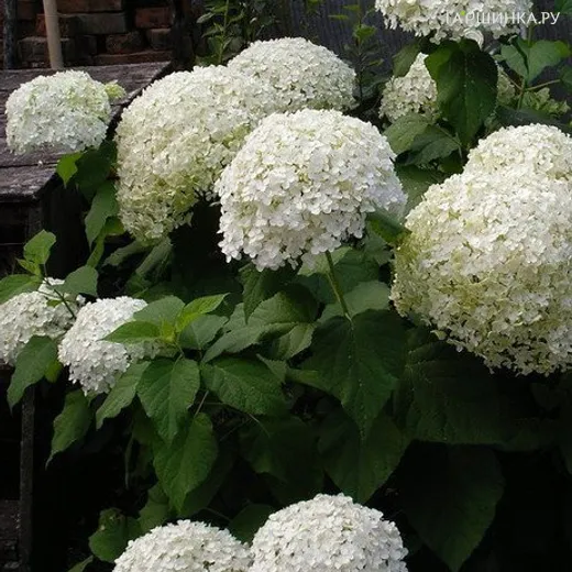Гортензия Баунти (Щедрая награда) древовидная - крупные яйцевидные листья светло-зеленого цвета, снизу сизоватые. Цветение продолжительное, в течение всего лета до сентября, если обеспечен хороший полив. Белые цветки собраны в соцветия 20 - 30 см в диаметре. Куст формирует крепкие цветоносы, что предотвращает поникание соцветий после дождя и при поливе. Быстро растет и обильно цветет на свету. Кусты высотой 1 м и шириной до 1,5 м. Весной следует обрезать для хорошего цветения. Цветёт в июле-сентябре на побегах текущего года. Для полутенистых и солнечных участков с влажной почвой. Более терпима к солнцу, чем другие гортензии. В сильные морозы может подмерзать, но отрастает и полностью восстанавливая крону.