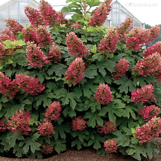 Гортензия Аметист дуболистная - яркий и выразительный сорт для тех, кто хочет придать саду особый колорит и структуру. Сильнорослый куст образует аккуратную шаровидную форму, достигая до 2 метров в высоту и ширину. Побеги мощные, вертикально растущие и густо расположенные, без проблем удерживают тяжёлые метёлки даже в период обильного цветения. Молодые стебли выделяются золотисто-жёлтой окраской и лёгким опушением, создавая декоративный акцент ещё до раскрытия бутонов.