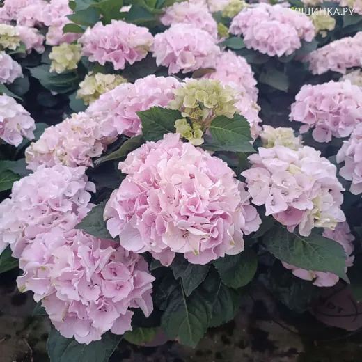Гортензия Элегант Роза крупнолистная (серия Рембрандт) - до 1 метра в высоту, на балконе или террасе вырастает до 60 сантиметров. Соцветия крупные, до 25 сантиметров в диаметре. Отличается продолжительным цветением — с июня до первых заморозков. Расцветка лепестков необычная, с растяжкой цвета от розового до нежно-салатового, листья насыщенно-зеленые. Подходит для одиночных и групповых посадок. Условия для роскошного цветения — достаточный полив и солнечный свет.