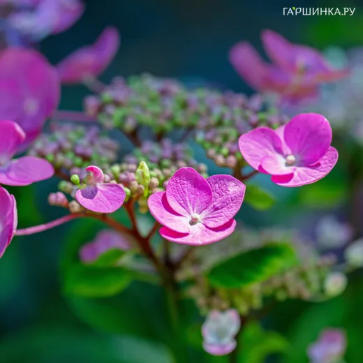 Гортензия Фазан крупнолистная (макрофила) - Куст высотой до 1,5 м, с чашевидной кроной. Цветы от красно-розовых до фиолетовых, округлой формы, крупные, собраны в зонтичные соцветия. Цветет в июле-августе.