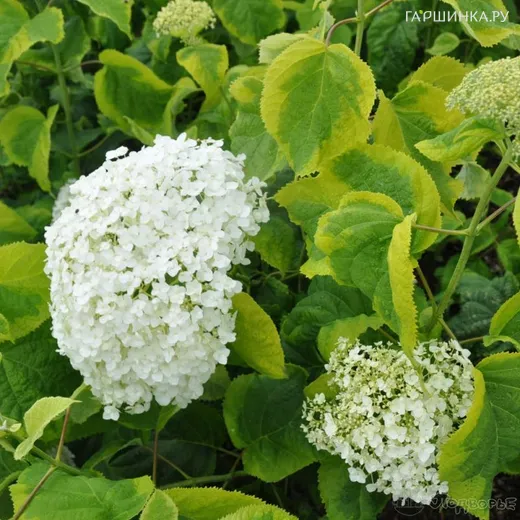 Гортензия Голден Анабель древовидная - Пестролистная форма от сорта «Annabelle». Куст высотой 120-150 см и шириной 90-150 см. Листья зелёные с нерегулярной кремово-жёлтой каймой. Соцветия крупные, симметричные, диаметром до 25 см. Цветки кремово-белые. Цветёт на побегах текущего года очень обильно, в июле-августе. Требует плодородной, влажной, хорошо дренированной почвы. Место полутенистое или солнечное. Очень эффектна в одиночных и групповых посадках.