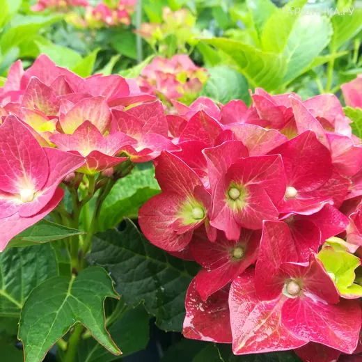Гортензия Грин Шадоу крупнолистная (макрофила) - Сорт с красными шаровидными соцветиями и ярко-зеленой листвой. Средние размеры кустарника позволяют сажать его в горшке или перед клумбой. Рост взрослого растения до 140см. В кислой почве он приобретает красивые винно-красные оттенки. Цветение июль-октябрь.
