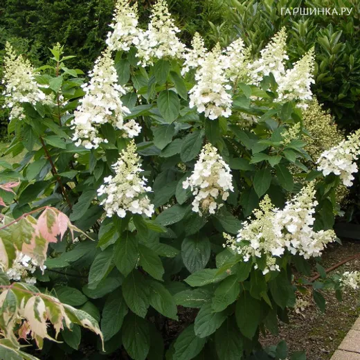 Гортензия Киушу (Тип шага) метельчатая - метельчатая. Высота кустарника до 2,4 м, ширина 1,5 м. Вазообразная крона, соцветия крупные. Окраска соцветия белая, окраску не меняет. Цветение обильное и продолжительное. Первое цветение в год посадки. Цветет на побегах текущего года.