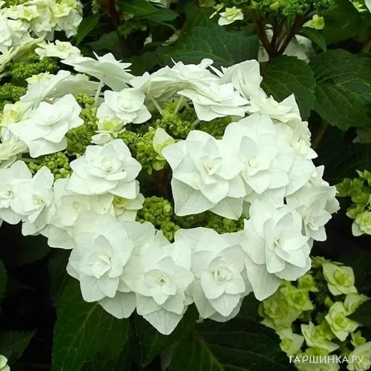 Продавец: ИНН 575310017900Гортензия Доппио Бьянко крупнолистная (макрофила) - куст компактный, с прочными побегами. Зацветает раньше, чем все остальные сорта крупнолистной гортензий и заканчивает цветение позднее, чем другие. Каждый цветок напоминает мини-свадебный букет. Внешние большие двойные махровые цветы, центр заполнен небольшими махровыми цветочками. Цветок увеличивается в течение сезона и в конце похож на большой шар из снежинок. Осенью цветки окрашиваются в бордовые оттенки с зеленым налетом.