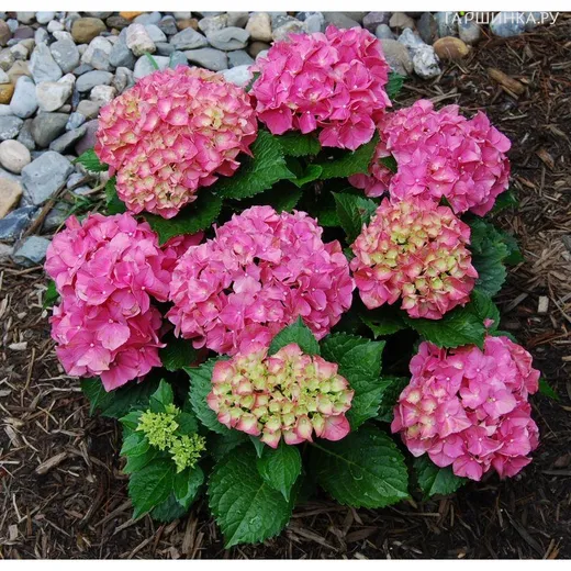 Гортензия Пинк (Розовая) крупнолистная ремонтантная (серия Навсегда и Вечно) - Кустарник высотой около 1 м. Цветет на побегах прошлого и текущего года. Цветение очень обильное и длительное (с конца июня до октября). Соцветия крупные, шарообразные, многочисленные. Цветки имеют насыщенно розовый цвет, но на одном растении могут быть цветки разных оттенков.