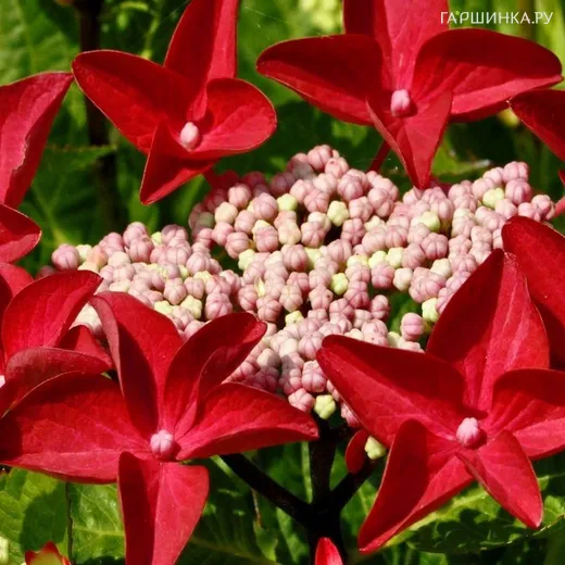 Гортензия Ротшванц крупнолистная (макрофила) - имеет броские, плоские соцветия. Цветки внутренние фертильные многочисленные мелкие розовые, внешние стерильные крупные пурпурно-красные. Кустарник высотой 1 – 2 м. При выращивании в контейнерах имеет высоту 0.4 – 0.6 м. У крупнолистной гортензии плотная ярко-зеленая листва, прошлогодние побеги одревесневшие, текущего года – зеленые, травянистые, древеснеют только в следующем году. Так же как и остальные, крупнолистные гортензии цветут на концах однолетних побегов выросших из нескольких верхних почек побегов предыдущего года. Поэтому обычно говорят, что крупнолистная гортензия цветет на прошлогодних побегах. Требует укрытия на зиму. Цветёт с июля до заморозков. Устойчива к заболеваниям.