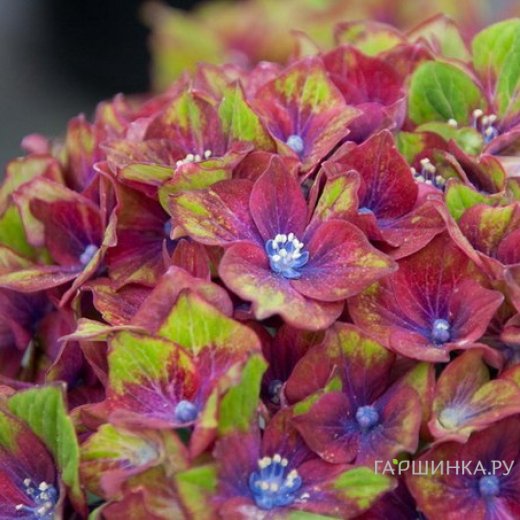 Гортензия Шлосс Вакербарт крупнолистная (макрофила) - Соцветие шаровидное, плотное, довольно крупное. Цветки среднего размера, 3-5 см, красно-малинового цвета с сине-фиолетовой серединкой и синим центром. Чем более кислая почва, тем ярче синий цвет. К концу цветения концы лепестков зеленеют. Куст высотой: 120-130 см. шириной: 120 см. Цветет с июля до заморозков. Выносливое растение и устойчиво ко многим заболеваниям. Располагают на солнце или в полутени на плодородных, влажных, хорошо дренированных почвах.