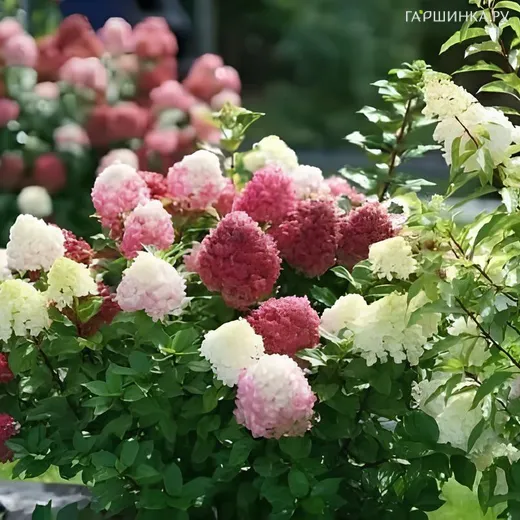 Крупные (около 30 см), плотные, пирамидальной формы соцветия обладают великолепной палитрой оттенков. Здесь и лаймово-зеленые, и белоснежные, и нежно-розовые, и малиновые, и насыщенно-рубиновые тона. Цветовые переходы идут снизу-вверх, так что на одном кустарнике можно увидеть сразу всю игру красок. Цветение раннее, начинается в конце июня, а завершается в октябре, перед заморозками. Соцветия появляются на побегах текущего года.