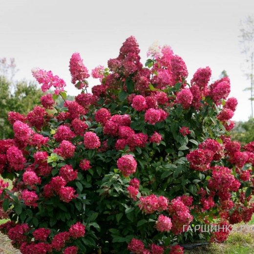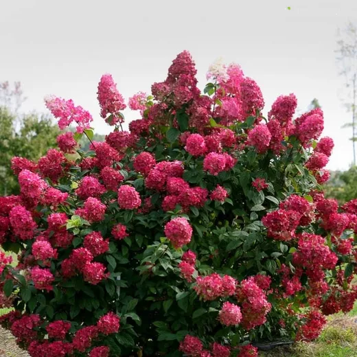 Гортензия Мэджикал Везувио метельчатая - куст раскидистый вырастает до 1-1,5 метра, округлый, в ширину он почти такого же размера, как в высоту. Ветви прямые, жесткие, коричневые. Листва крупная, с острыми кончиками, густо-зеленая. Соцветия крупные, по 20-30 см в длину, конусовидные, густые, белого цвета, потом розовеют, затем приобретают очень яркий, кроваво-малиновый цвет. Цветки преимущественно стерильные.