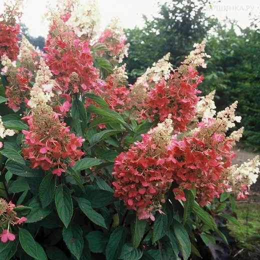 Гортензия Пинк Квин (Розовая королева) метельчатая - кустарник высотой до 2–2,5 м с пышной кроной, темно-зелеными крупными листьями и красными черешками. В период с июля по октябрь обильно цветет. Крупные соцветия конической формы длиной до 30–35 см состоят из цветков с крупными лепестками. Сначала они в кремовых тонах, со временем становятся ярко-розовыми.