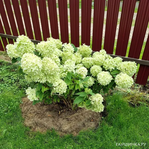 Саженец пришел крепкий. На первом году не цвел совсем. Вот ему уже 3 года. Цветет обильно большими соцветиями. Ращмер куста сейчас в высоту и ширину около 60 см. На фото розовый он к середине сентября, а все летнее время цветы зеленоватого окраса.