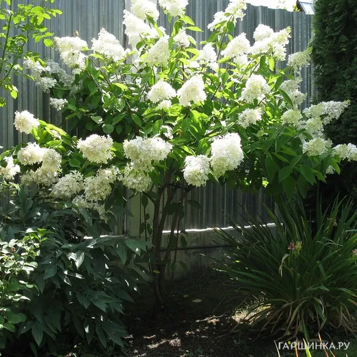 Одной из самых декоративных можно по праву назвать гортензию метельчатую. Это кустарник или маленькое деревце до 3 м высотой с густой шаровидной кроной. Соцветия крупные, по форме напоминают широкую кисть. Цветет с июля до осени, кусты в это время покрыты пеной поникших от собственной тяжести кремово-белых соцветий, некоторые сорта на ярком солнце приобретают нежно-розовый «румянец». Обоеполые цветки быстро осыпаются, а бесплодные с крупными белыми, постепенно розовеющими чашелистиками сохраняются до октября. Срезанные в сентябре соцветия служат прекрасным компонентом зимних букетов и композиций.