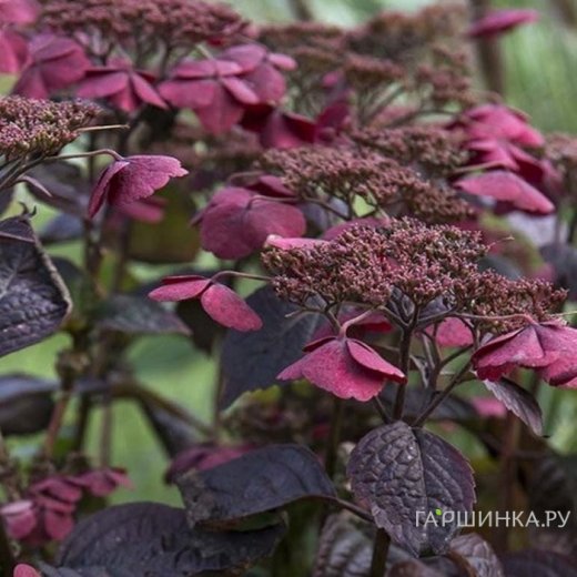 Гортензия Даредевил (Сорвиголова) пильчатая - Темно-красные молодые побеги, на которых летом появляются ярко-розовые кружевные цветки (на кислой почве цветки темно-пурпурного цвета). В конце цветения засохшие цветки темно-красного цвета сохраняют свой цвет и держатся всю зиму. Цветы и темно-шоколадная блестящая листва красиво контрастируют. По сравнению с другими разновидностями пильчатых гортензий, у этого сорта листва летом остается очень темной (даже на солнечном месте). Вырастает в высоту до 50-60 см и шириной 100 см. Цветет на однолетних ветвях и очень морозостойка. Отлично подходит для массовой посадки.
