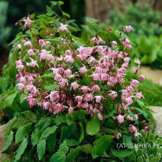 Горянка пышная Розеум - куст высотой 20-25 см. Молодые листочки с бронзовым оттенком, летом становятся зелеными, а осенью опять приобретают красивую окраску в коричнево-розовых тонах. Цветки мелкие розовые диаметром до 2 см, свисающие, лепестки овальные без шпорцев. Цветки от 4 до 15 на крепком стебле.. Период цветения май-июнь. В бесснежные зимы подмерзает. Зона зимостойкости: 4 (-35 ° С).