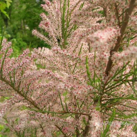 Гребенщик (тамарикс) четырехтычинковый - крупный кустарник, до 5-6 м высотой, с буровато-красными, дугообразно изогнутыми ветвями. Листья ланцетные или яйцевидно-ланцетные, с клювовидной, заостренной вершиной, суженные к основанию. Цветки от светло-розовых до белых, в рыхлых кистях на боковых побегах. Цветет в апреле — мае. Растет хорошо. Засухоустойчив. Долговечен, живет до 75 лет. Используется в одиночных и групповых посадках, в живых изгородях. Представляет значительный декоративный интерес изумрудно-зелеными листьями и темными ветвями.