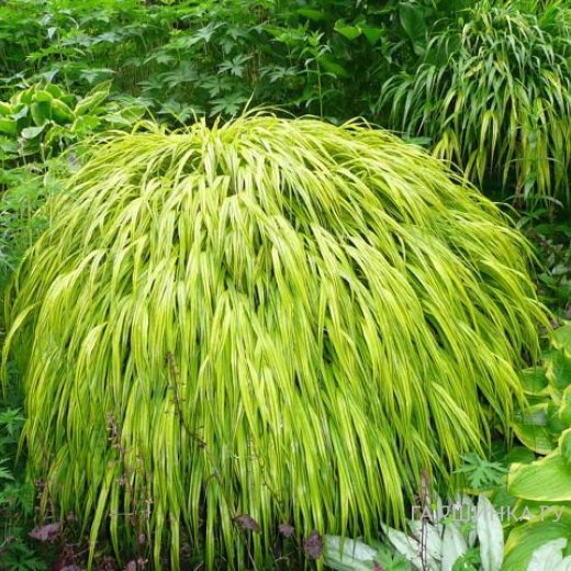 Хаконехлоа большая Ауреола (Hakonechloa macra Aureola) - Высота куста 35 - 40 см, ширина до 50 см. Цветение: июль-август. Декоративна весь сезон. Красочная, изящная трава с длинными стройными золотистыми листьями с зелеными полосками. На цвет листвы сильно влияет температура. В теплых регионах желтый цвет выражен более ярко. Перепады температуры весной и осенью часто вызывают легкое покраснение у листьев. Растение горит на слишком ярком солнце и теряет яркость в тени. Зона зимостойкости: 4.