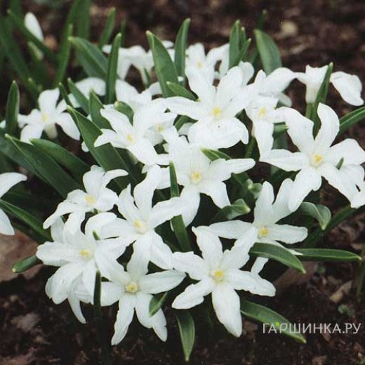 Хионодокса Люцилии Альба 15шт - цветки   имеют снежно-белую окраску. Изящное, низкорослое луковичное растение с прикорневыми листьями, которые появляются одновременно с цветоносами.   Цветки колокольчатые, состоят из шести лепестков, до 2  см в диаметре, собраны в рыхлое кистевидное соцветие с распростертым околоцветником, листочки которого сросшиеся в основании и слегка отогнуты назад. Высота растения около 10-15 см. Хинодокса довольно зимостойкое растение способное переносить без повреждений даже сильные весенние заморозки. Весной хионодоксы расцветают одними из первых, а в разгар лета, в июне, увядают.