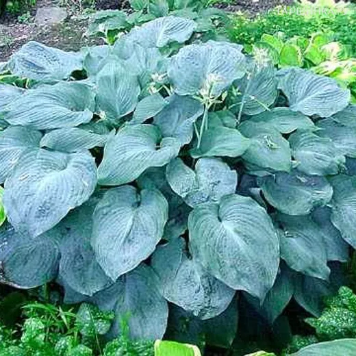 Хоста Блу Энджел (L) - Гигантская хоста каскадной формы для тени, переносит лишь утреннее солнце. Листовые пластины очень толстые, широкоовальные, слегка морщинистые, с волнистым краем. Сизый восковой налёт по тёмно-зелёному или интенсивно сине-зелёному. Синяя окраска лучше сохраняется в тени, на солнце зеленеет. Почти белые крупные цветки в плотных соцветиях. Куст высотой 80-90 см. Ширина куста до 90 см.  Листовые пластинки огромные 30 х 40 см Период цветения июль-август. Зона зимостойкости: 3 (-40 ° С)