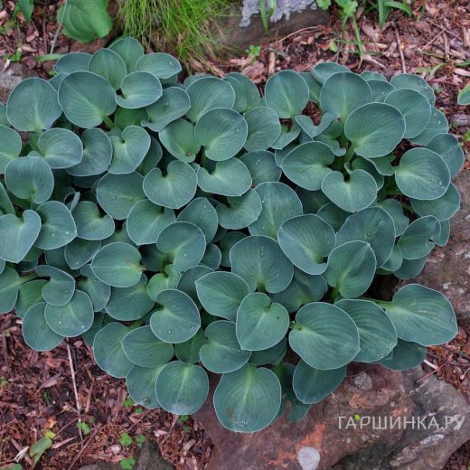 Хоста Блу Маус Иэрз (S) - Листовая пластина очень плотная, как бы резиновая, сине-зеленая, с небольшими выемками, край почти ровный. Лист слегка чашевидный, в молодом возрасте овальный, в зрелом возрасте почти круглый, с острым кончиком. Черешок прочный, мелкий, темно-зеленый. Цветок колокольчатый, насыщенного лавандового цвета с фиолетовыми полосами, в кистях на толстом, прямом, облиственном бледно-зеленом стебле.