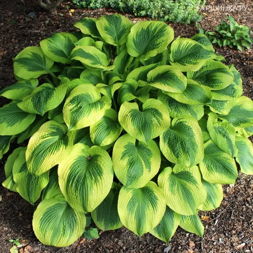 Хоста Клаймакс (L) - Листовая пластина достаточно плотная, от насыщенно- зеленой до темно-зеленой, с широкой неравномерной шартрезной каймой, которая затем становится золотисто-желтой, с промежуточными шартрезными полосами, доходящими до главной (средней) жилки листа, матовая сверху и с легким сизым налетом снизу, жатая, край слегка волнистый. Лист у основания чашеобразный, затем изгибающийся, почти круглый, с острым кончиком Черешок зеленый, с желтым контуром. Листовая пластинка размером 35 x 23 см. Куст высотой до 100 см. Ширина куста до 65 см. Период цветения июль. Зона зимостойкости: 3 (-40 ° С)