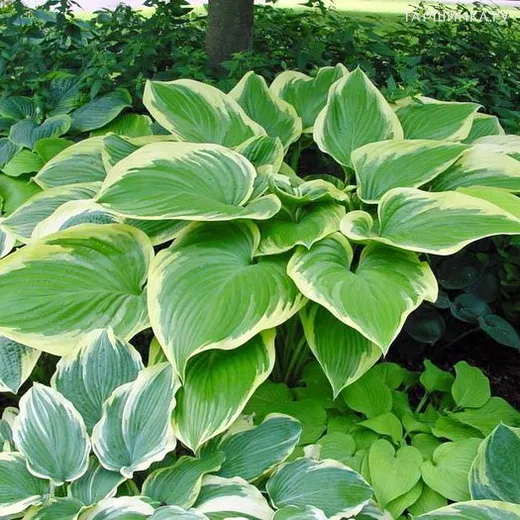 Хоста Финал Виктори (XL) - эффектный, корневищный, неприхотливый многолетник. Размер куста большой, листья высотой 75 см, цветоносы 90 см. Лист плотный, зеленый, блестящий, чашевидный, зеленый, с широкой желто-кремовой каймой, огромного размера 26*20 см, окраска сильно зависит от освещенности. Окраска цветка бледно-лавандовая. Зона зимостойкости 3.