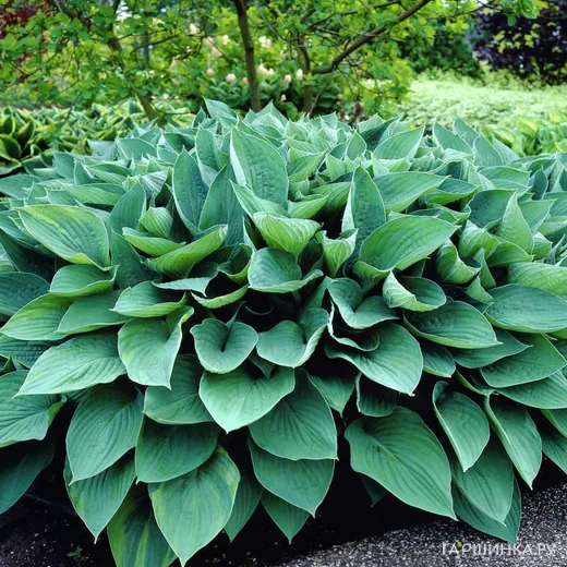 Высота куста 60 см. Листья сизо-зеленые с матовым налетом. Форма сердцевидная, кончик заостренный.