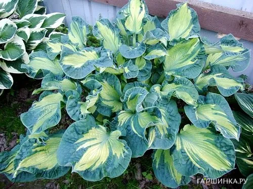Хоста Голден Медоуз (ML) - Листья округлые, морщинистые, "крученые"; центр весной ярко-золотистый, в середине лета кремовый, затем зеленеет до цвета шартрез, с очень широкой неравномерной тёмно-голубовато-зелёной каймой, с язычками к центру листа, цветки белые. Высота куста 50-60 см. Период цветения июль-август. Зона зимостойкости: 4 (- 35 ° С)