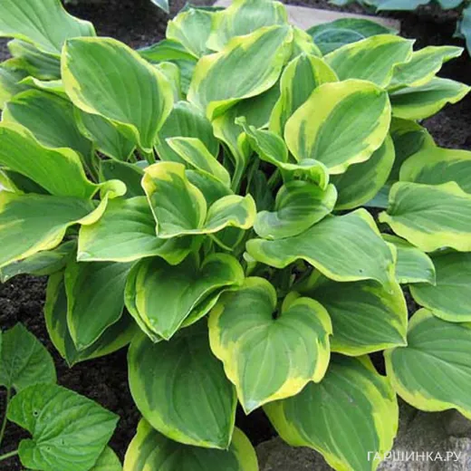 Хоста Голден Тиара (SM) - Листовая пластина средней плотности, зеленая, с неравномерной сначала шартрезной, затем желтой, светлеющей в течение сезона до кремовой каймой, с переходными шартрезными полосами, матовая сверху и глянцевая снизу, с возрастом с небольшими выемками, край слегка волнистый. Лист широкоовальный, с острым кончиком. Цветы многочисленные, сиреневые. Листовая пластинка размером 13 x 11 см. Куст раскидистый, высотой до 40 см. Ширина куста до 95 см. Период цветения июль-август. Зона зимостойкости: 3 (-40 ° С)