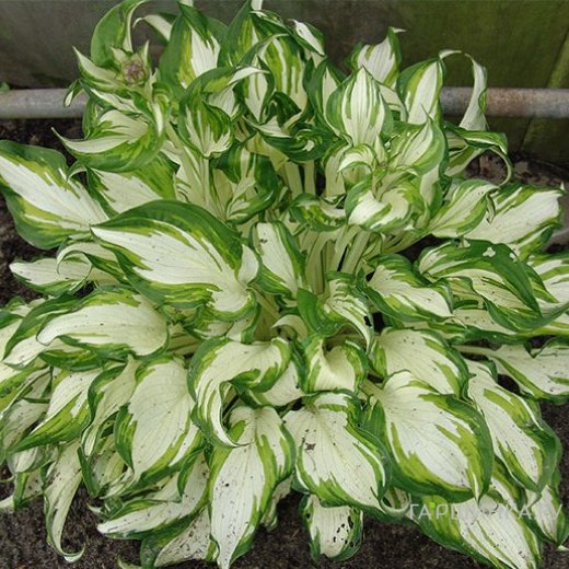 Хоста Киви Сперминт (М) - Белые, сильно закрученные листья, с зелеными краями и более светлыми полосами. К концу сезона зеленого цвета становится больше. Цветки бледно-лавандовые. Куст высотой до 30 см. Ширина куста до 45 см. Период цветения июль. Зона зимостойкости: 3 (-40 ° С)