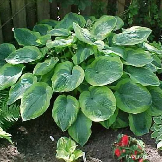 Хоста Олив Бэйли Лангдон (L) - Листья большие, округлые, сине-зеленые с желтовато-зеленой каймой. Не выгорает на солнце, быстро растет. Цветы белые. Куст высотой до 70 см. Ширина куста до 100 см. Период цветения июль. Зона зимостойкости: 3 (-40 ° С)
