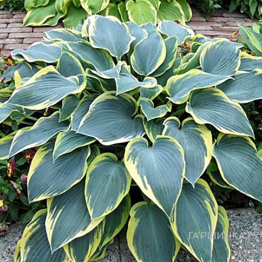 Хоста Роберт Фрост (M) - Листья округлые темные сине-зеленые, плотные, слегка морщинистые, с широкой неправильной формы желто-кремовой каймой, которая становится почти белой в конце сезона. Некоторые светлые штрихи тянутся к самой середине листа. Цветы белые на высоких цветоносах. Крупная, быстро растущая хоста. Куст высотой до 70 см. Ширина куста до 90 см. Цветоносы 90 см. Период цветения июль. Зона зимостойкости: 3 (-40 ° С)