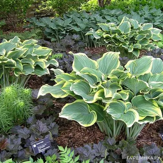 Хоста Сагае (VL) - Обладательница плотных, слегка волнистых сизо-зеленых листьев с ярко-желтой каймой, впоследствии изменяющей цвет на золотисто-желтый, вплоть до белого. Крупная, быстро растущая хоста. Куст высотой до 70 см. Ширина куста до 140 см. Период цветения август. Зона зимостойкости: 3 (-40 ° С)