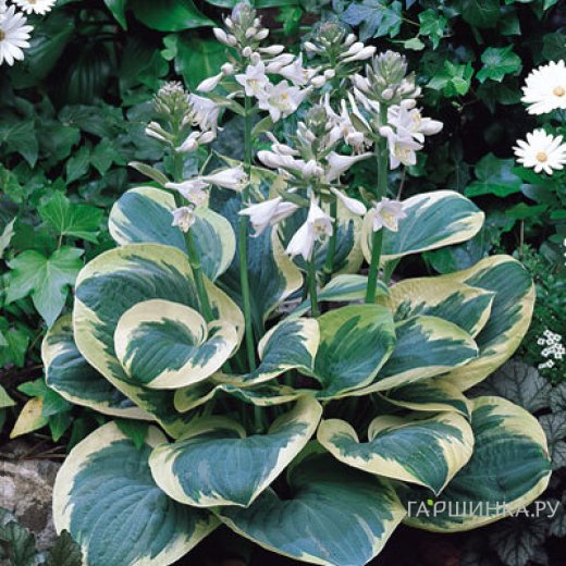 Хоста Сноу Кап (M) - Сердцевидные, жатые, слегка чашевидные сизо-зелёные листья с неравномерной кремово-белой каймой. Белые с лавандовым оттенком воронковидные цветки. Разрастается медленно. Куст высотой до 50 см. Ширина куста до 120 см. Период цветения июнь-июль. Зона зимостойкости: 3 (-40 ° С)