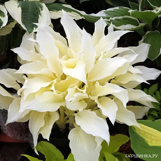 Хоста Вайт Фезе (Белое перо) (M) - Листья узкие, волнистые, белые весной, затем меняются на зелёные с белыми полосами. Цветки светло-лавандовые. Крупная, быстро растущая хоста. Куст высотой до 35см. Период цветения июль-август. Зона зимостойкости: 3 (-40 ° С)