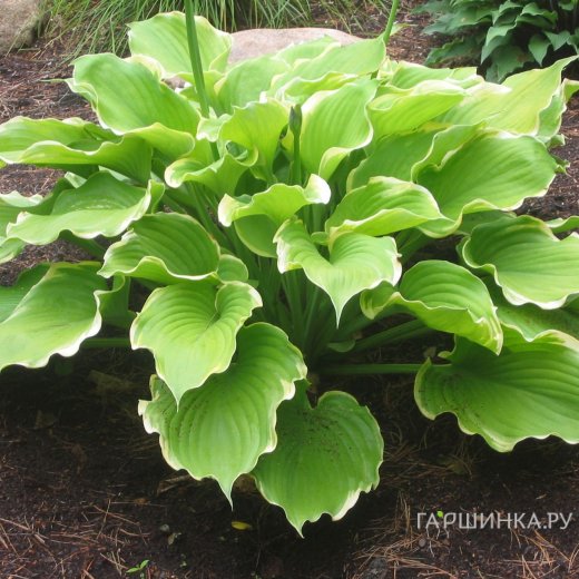 Хоста Винтер Сноу (M) - Листья очень крупные, округлой формы, гофрированные, зеленовато-желтые с кремово-белой каймой. Цветы светло-сиреневые. Куст высотой до 40-60 см. Ширина куста до 80 см. Период цветения июль-август. Зона зимостойкости: 3 (-40 ° С)
