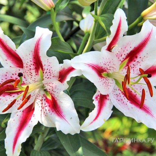 Лилия Хотпост восточная /2шт - Цветки крупные, диаметром 25 см, белые с красно-розовыми широкими лучами вдоль лепестка и крапом. Растут вверх и в сторону. Зацветает в июле-августе. Имеет приятный аромат. Высота растения 120 см. Расположение для посадки - открытые и затенённые места. Растение требует укрытия в первый год.