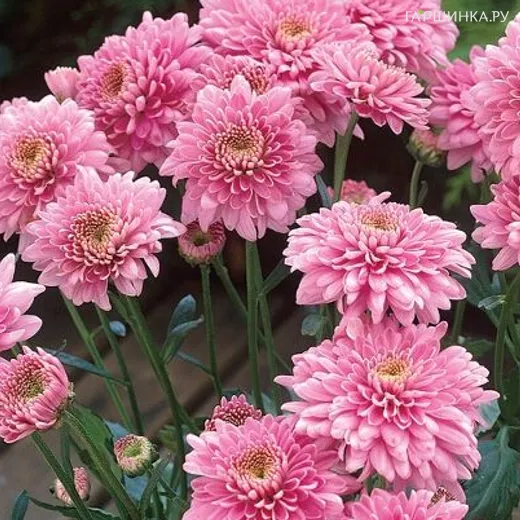 Хризантема Гомпай Пинк уличн. - Относится к группе кустовых хризантем. Стебель мощный, в высоту достигает 70 см, листва густая, насыщенного зеленого цвета. Крупные, розовые цветы появляются в конце августа, цветение в регионах с теплым климатом может продлиться всю осень. В диаметре цветок 8-10 см. В срезке устойчивость высокая, до 20 дней.