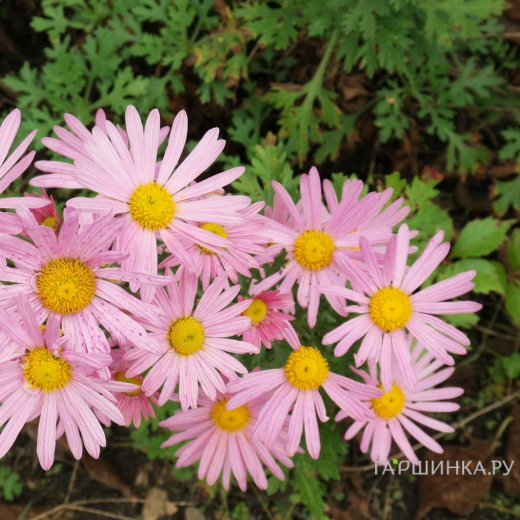 Хризантема Клара Кертис - многолетний травянистый полукустарник семейства Сложноцветные. Высота 50-70 см, около 50 см в диаметре. Простые по форме цветы с розовым оттенком лепестков и ярко-желтой серединкой. Размеры соцветий достигают 7-8 см. Период цветения длительный: начинается в августе и продолжается вплоть до первых заморозков.