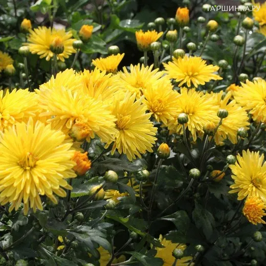 Хризантема Корейская золотая - многолетний травянистый полукустарник семейства Сложноцветные. Высота до 40 см. Кустистое растение с огромным количеством ярких желтых соцветий. Продолжительно и обильно цветет с июля.