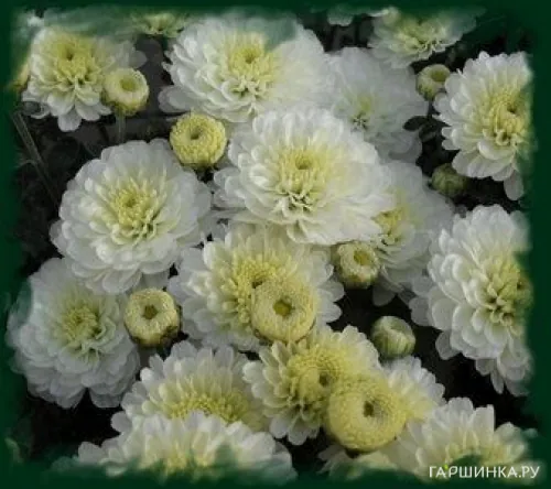 Хризантема мультифлора Джиджи Сноу - Хризантемы низкорослые шаровидные, махровые. Цвет снежно-белый. Диаметр соцветий 3-4 см, в высоту растение вытягивается не более чем на 40см. Сорт относится к среднеранним: начинает цвести в первую неделю сентября и отцветает к ноябрю.