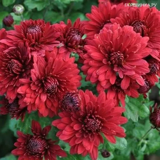 Хризантема Юрий Гагарин - многолетний травянистый полукустарник семейства Сложноцветные. Высота 40 см. Цветки насыщенного бордового цвета, махровые 6 см в диаметре. Начало цветения: первая половина сентября.