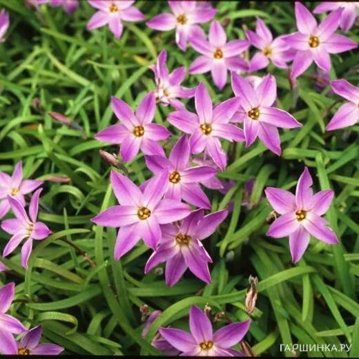 Ифейон Шарлотта Бишоп 10шт. Нежно-розовые звездообразные цветки около 2 см в диаметре. Приятный легкий аромат. По центру каждого лепестка проходит более яркая небольшая полоска. Цветение очень обильное, происходит, как правило, в конце весны. Хорошо разрастается. Высота растения: 15-20 см. Зона зимостойкости: 5 (-29)