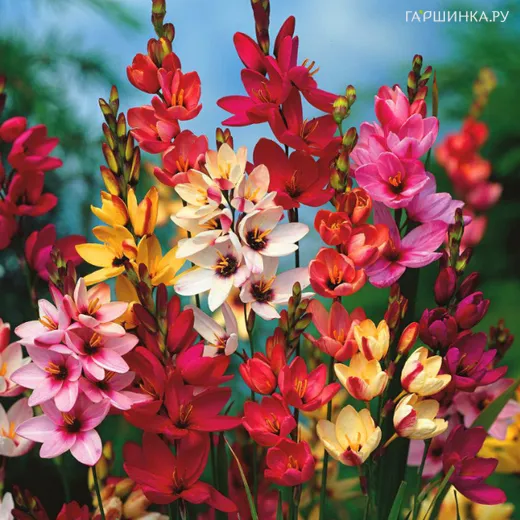 Иксия Микс 10шт - относится к клубнелуковичному семейству ирисовых. На безлиственном цветоносе располагаются колосковидные соцветия с цветками в форме симметричных звёздочек. Размер цветка в диаметре – 2,5-5 см. По 10-12 таких цветков собрано в тонкое колосовидное соцветие высотой 30-40 см. Распускается иксия только при ясной погоде. В пасмурный день и ночью она закрыта. Соцветия обрамлены двумя рядами сочных мечевидных листьев, растущих прямо из корнелуковиц. Иксия зацветает в конце весны или в начале лета. Цветёт недолго (3-4 недели), но обильно.