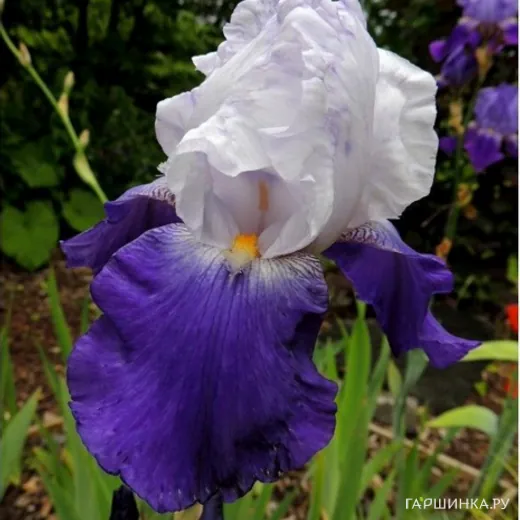 Ирис бородатый Arpege многолетнее травянистое растение с мощными стеблями и вытянутыми прикорневыми зелёными листьями. Куст достигает высоты 80-90 см. Цветы крупные, двуцветные: верхние лепестки белые, нижние - сине-фиолетовые. Период цветения май-июнь.