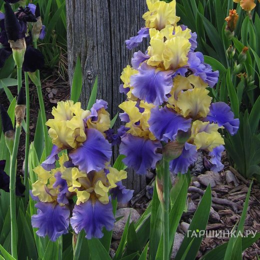 Ирис (касатик) - многолетнее корневищное травянистое растение семейства Ирисовые. Листья по 5-7 штук отходят непосредственно от корневища, они линейные или мечевидные, зеленые или со слегка голубоватым оттенком. На одном цветоносе располагается по 2-7 цветков диаметром до 15 см. Окраска цветков разнообразна. Ирисы могут быть низкорослыми (до 40 см), среднерослыми (до 70 см) и высокорослыми (более 70 см). Наиболее распространенными в садоводстве являются ирисы бородатые. Наружные лепестки цветка ириса бородатого украшены контрастными полосками (волосками), за эту особенность он и получил свое название.