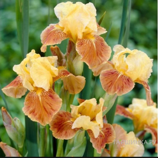 Описание Ирис бородатый Golden Muffin. Бутоны крупные до 15 см. Растение высотой 50-70 см., выпускаемая стрелка с цветками до 110 см., ширина куста 40 см. Цветение июнь- июль.