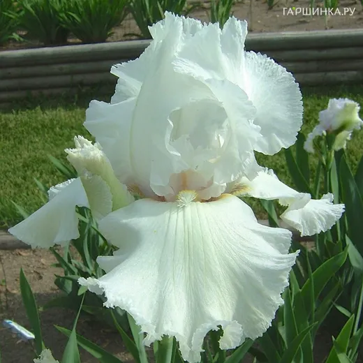 Ирис бородатый Лейси Сноуфлейк - Белоснежный высокорослый ирис с сильно гофрированными цветками. На одном растении 2-3 цветоноса, каждый из которых образует до 9 цветков! Время цветения приходится на май-июль в зависимости от места посадки. Цветок крупный, диаметром до 15 см, прекрасной формы, белоснежного цвета с примесью желтого в основании, с сильной гофрировкой и заметными кружевами по краям, бородка желто-мандариновая. Особенное отличие в сильном аромате и обильности цветения, продолжительностью 2-3 недели. Листья, линейные сизо-зеленые, что предает особый контраст цветку.