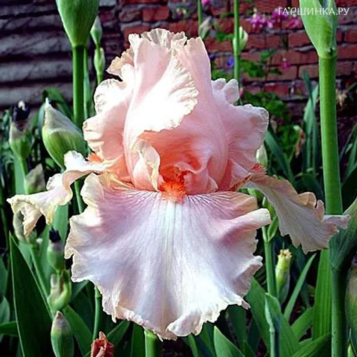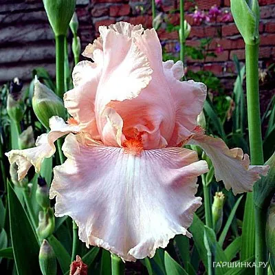Ирис бородатый Пинк Таффете - Цветки однотонные, светло-розовые с красновато-розовыми бородками, доли околоцветника гофрированные. Относится к группе высоких бородатых ирисов. Объёмные цветки в диаметре не менее 15 см, размещаются на плотных высоких стеблях длиной в 70- 80 см. Прикорневая листва собрана в вееровидный пучок, светло-зелёная из-за плотного воскового налёта. Цветение наступает уже в начале июня и длится несколько недель. Зимостойкость: высокая